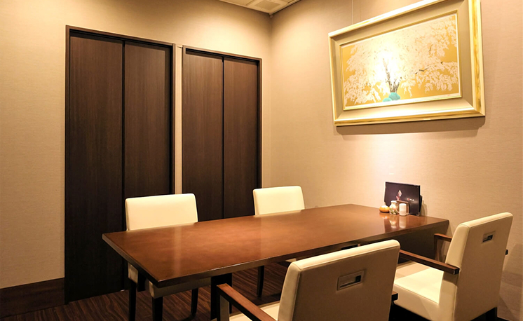 落ち着いた雰囲気の個室になっております。 接待や顔合わせなどの慶事ごと、法事などにご利用くださいませ。